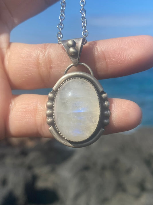 Sterling Silver Oval Rainbow Moonstone Necklace with Silver Accents